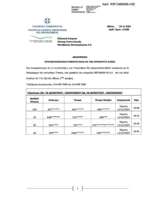 ΑΝΑΚΟΙΝΩΣΗ ΠΡΑΓΜΑΤΟΠΟΙΗΣΗΣ ΣΥΝΕΝΤΕΥΞΕΩΝ ΓΙΑ ΤΗΝ ΠΡΟΚΗΡΥΞΗ 1/2025