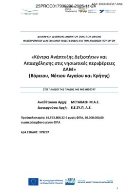 ΚEΝΤΡΑ ΑΝAΠΤΥΞΗΣ ΔΕΞΙΟΤHΤΩΝ ΚΑΙ ΑΠΑΣΧOΛΗΣΗΣ ΣΤΙΣ ΝΗΣΙΩΤΙΚEΣ ΠΕΡΙΦEΡΕΙΕΣ ΔΑΜ» (ΒOΡΕΙΟΥ, ΝOΤΙΟΥ ΑΙΓΑIΟΥ ΚΑΙ ΚΡHΤΗΣ)